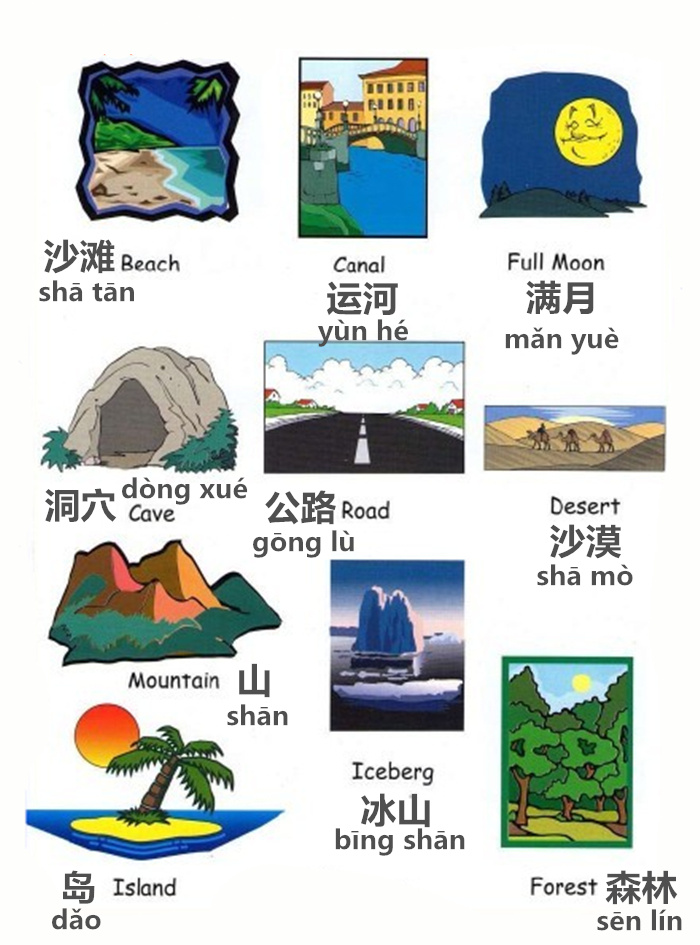 Learn Chinese Vocabulary in an Easy Way –Nouns Part 4Last updated: June 19, 2015Dig MandarinVocabulary EnglishChinesePinyinAudioBeach沙滩shā tān Canal运河yùn hé Full moon满月mǎn yuè Desert沙漠shā mò Road公路ɡōnɡ lù Cave洞穴dònɡ xué Mountain山shān Iceberg冰山bīnɡ shān Forest森林sēn lín Island岛dǎo Online Chinese Tutors1:1 online tutoring100% native professional tutorsFor all levelsFlexible scheduleMore effectiveLearn more twitter facebook linkedin email Dig MandarinYou May Also Like Learn Chinese Vocabulary in an Easy Way – Body part 6 Learn Chinese Vocabulary in an Easy Way – Body part 5 Learn Chinese Vocabulary in an Easy Way – Body part 4Show 0 CommentsThis Post Has 0 CommentsLeave a Reply Cancel replyYour email address will not be published. Required fields are marked *Name * Email * Website Comment * Δ