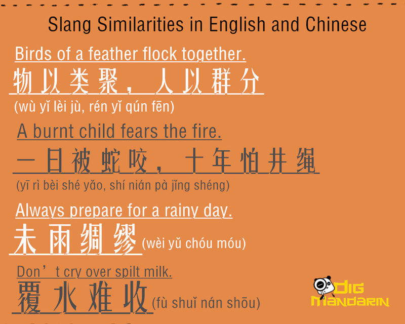 In the process of learning Chinese, you may find that many slangs or idioms between Chinese and English are similar, like in English “a piece of cake”and in Chinese “小菜一碟 xiǎo cài yì dié”, both expressing how easy something is; in English “casting pearls before swine” and in Chinese “对牛弹琴 duì niú tán qín”, both meaning chatting with the wrong one who could not ever understand you. These slangs and idioms are always used in daily communications. They make learning Chinese more and more interesting and easier for us, don’t they? Now, let’s get more examples: